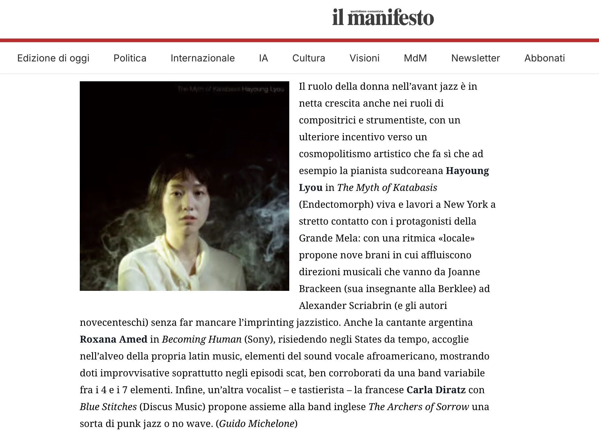 Il ruolo della donna nell'avant jazz è in netta crescita anche nei ruoli di compositrici e strumentiste, con un ulteriore incentivo verso un cosmopolitismo artistico che fa sì che ad esempio la pianista sudcoreana Hayoung Lyou in The Myth of Katabasis (Endectomorph) viva e lavori a New York a stretto contatto con i protagonisti della Grande Mela: con una ritmica «locale» propone nove brani in cui affluiscono direzioni musicali che vanno da Joanne Brackeen (sua insegnante alla Berklee) ad Alexander Scriabrin (e gli autori novecenteschi) senza far mancare l'imprinting jazzistico.